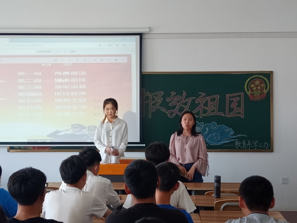 为普及大学生征兵入伍的常识,教育系于2019年6月12日下午2:30在综合楼1303教室成功举办了投身国防报效祖国征兵大会。出席此次会议的有我系辅导员崔馨月老师,分团委组织部部长,18级部分学生。