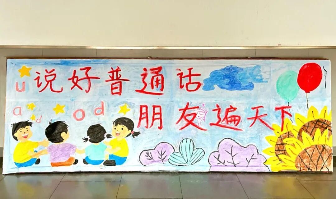 推普周的校园里,一幅童趣盎然的板报同样格外吸睛。“说好普通话,朋友遍天下”的红色大字鲜艳醒目,以孩童视角将推广普通话的理念生动传递。它诠释着普通话作为社交桥梁的独特魅力,让不同背景的人能在同一种语言里结下真挚情谊,既成为推普周里一道灵动的风景线,又让“说好普通话”的种子在师生心间悄然扎根、蓬勃生长。