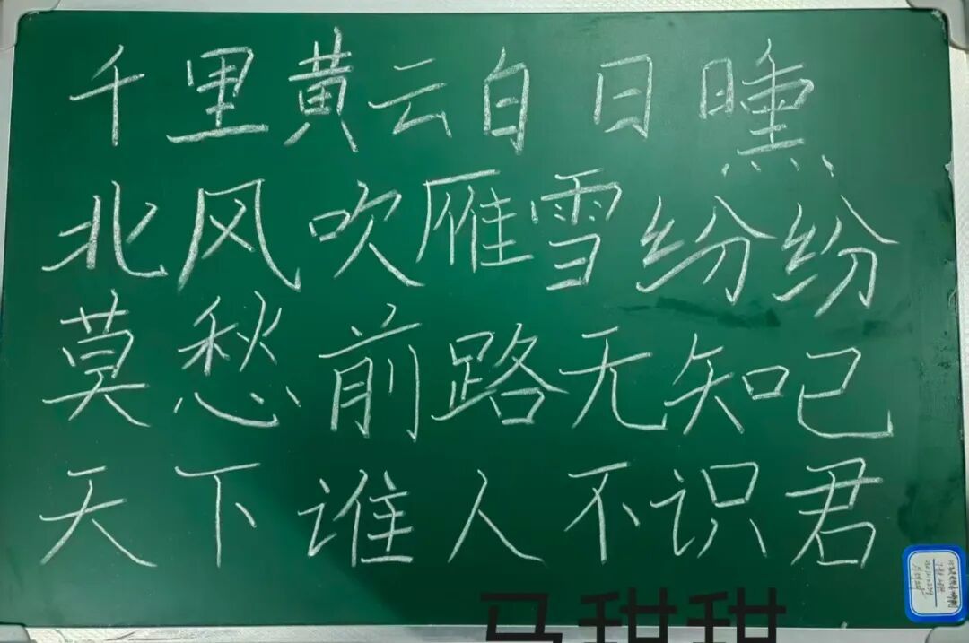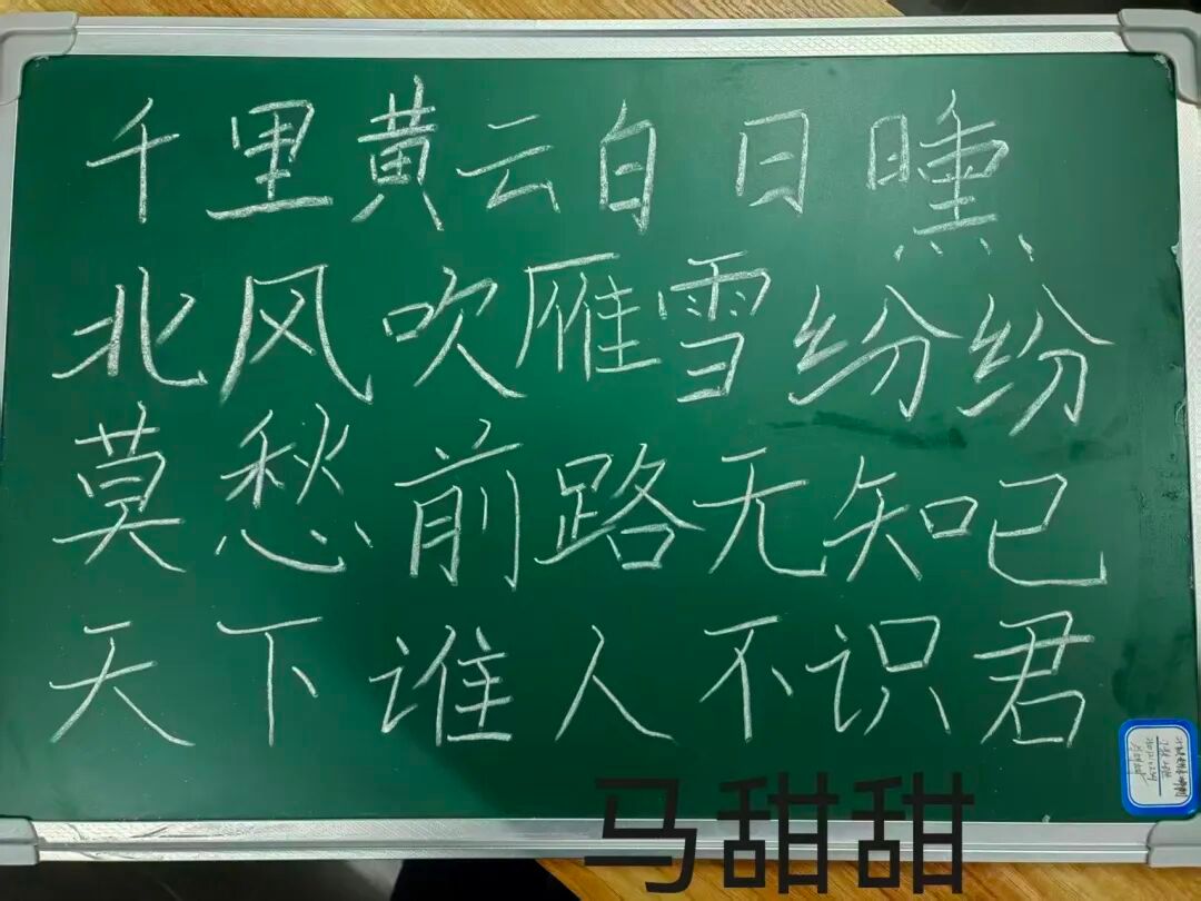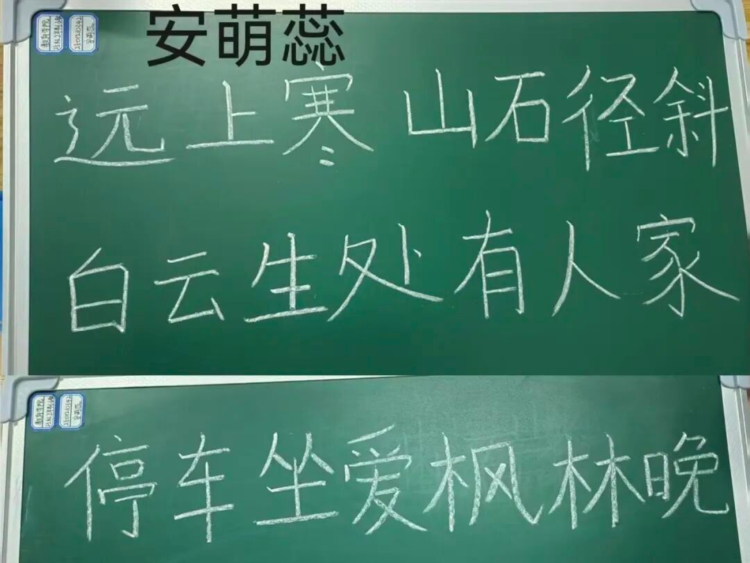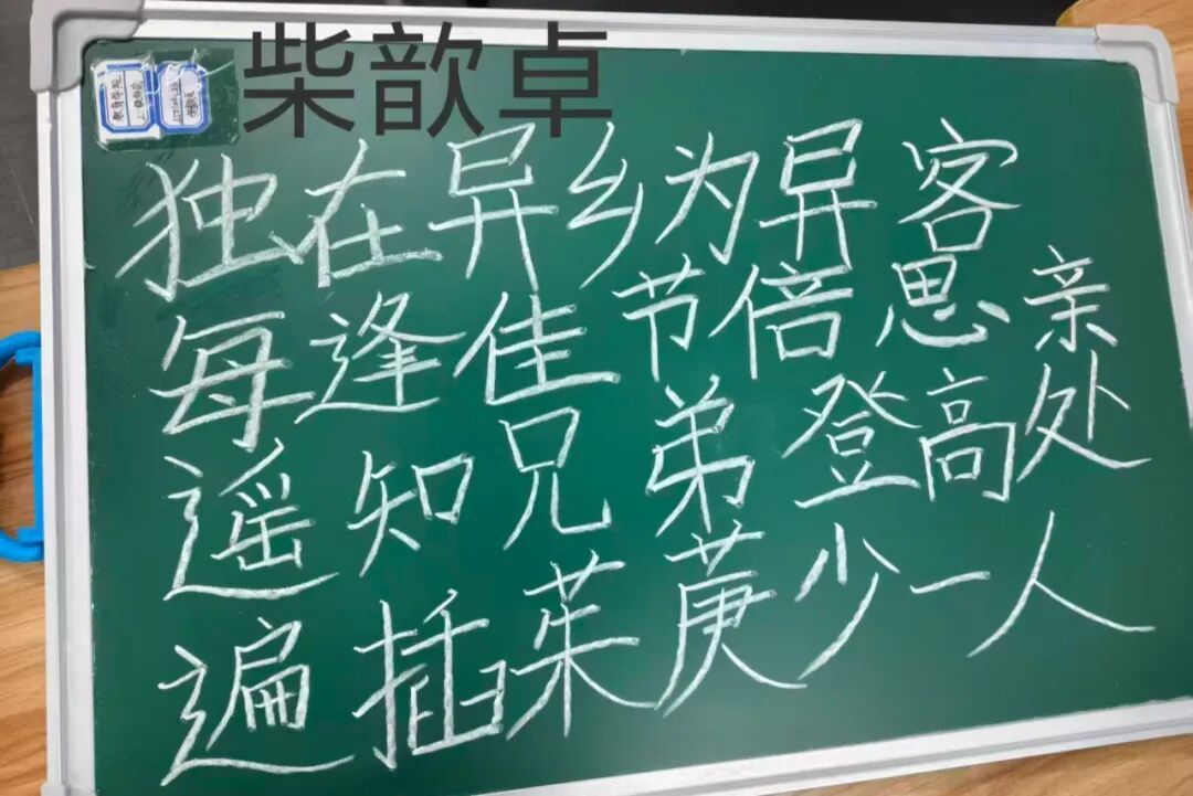 本次考核围绕小学75首古诗展开,采用现场随机抽签形式:同学们有序抽取题目后,在小黑板上完成诗句默写。