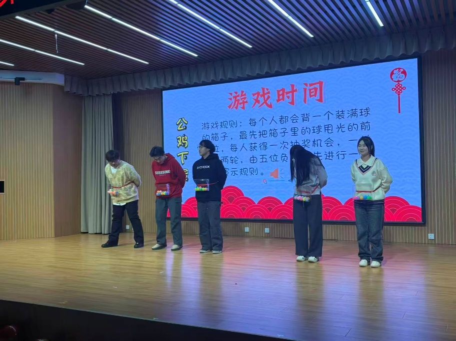 趣味互动环节成为晚会的欢乐支点:听歌识曲中选手们极速抢答,尽显音乐储备;“公鸡下蛋”游戏里,参与者的滑稽跃动让现场笑声不断,师生同窗的距离也在互动中悄然拉近。