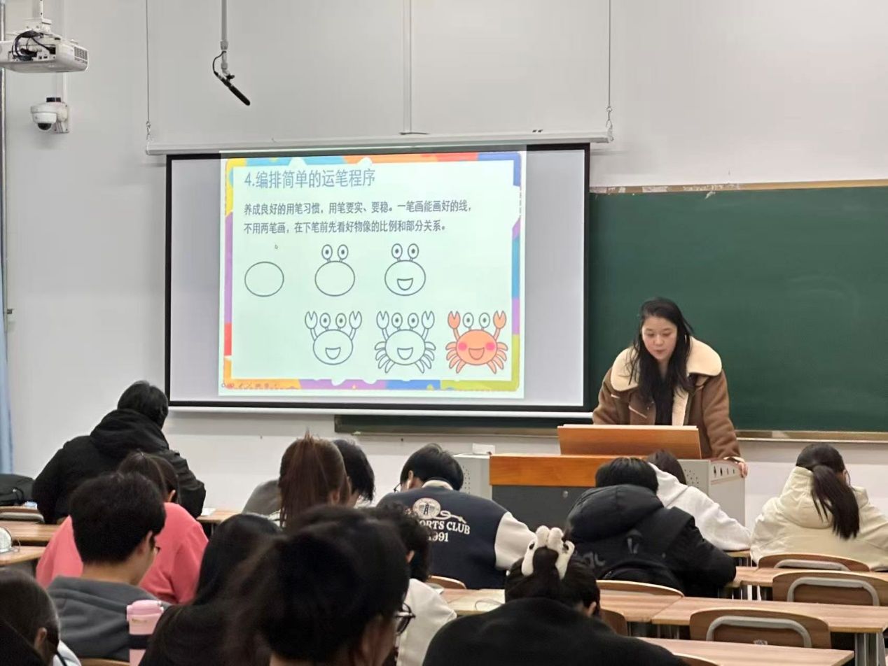 活动伊始,社联技能部部员结合专业性质在各个班级分别开展课程。在小教一、二班的朗诵技能课上,宣讲人重点强调了朗诵技巧的掌握,包括语音语调、节奏控制、情感表达等方面,并请同学们现场朗诵PPT上的范例,在实践中体会和运用相关技巧;在小教专升本三、四班的简笔画技能课上,同学们首先进行了点、线、面的基础练习。随后,宣讲人简要介绍了归类、分解等几种简笔画的造型方法,帮助同学们提升简笔画的造型能力;在小教专升本一、二班的毛笔书法技能课上,首先介绍了书写工具的种类及其挑选方法。随后讲解了毛笔书写的基本技巧。最后,全班共同欣赏了名家作品,在练习书法的同时提升审美素养;在学前一班的舞蹈技能课,首先带领同学们简要了解了舞蹈的种类,随后阐述了舞蹈作为美育教育重要方式的意义,强调教师掌握基本舞蹈技能有助于更好地开展校园文体活动,引导同学们重视舞蹈学习。
