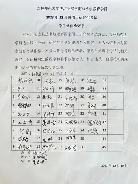 我院学生认真阅读且透彻理解了国家硕士研究生考试规则、吉林师范大学博达学院关于硕士研究生考试纪律的有关规定,签署后,同学们纷纷承诺不参与国家教育考试作弊、不参与替考等违法活动,并自觉遵守考试的相关规定,保证按规定的程序和要求参加考试,如有违反,自愿按相关规定中提到的有关条款接受处理。