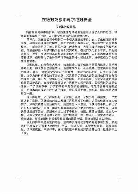 安全为人人,人人讲安全,事事为安全,时时想安全。安全知识是一个永久的课题,安全第一重于泰山,让安全走进我们的生活,充分认识到安全的重要性和紧迫性。让我们携手起来从自身做起,从现在做起,从点滴做起,防微杜渐,将安全知识牢记心中。