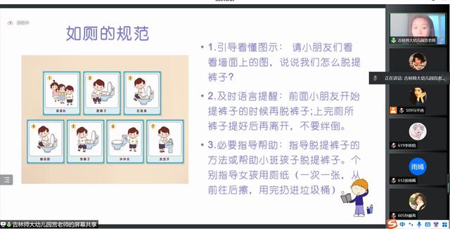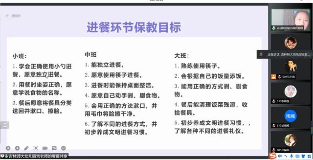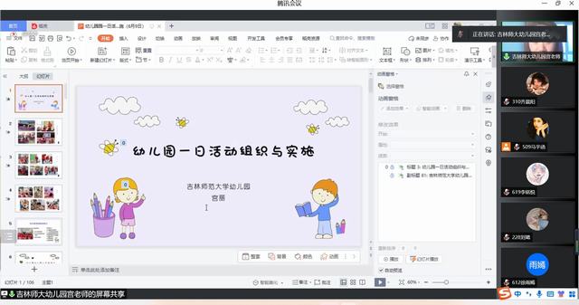 为了让同学们能更加了解幼儿园的工作,清晰幼儿园的工作内容,能够结合自身情况进行幼儿园教学规划,学前与小学教育学院大学生自学组织部于2022年6月8日—6月11日18:30在腾讯会议举办博言讲堂——实习实训系列讲座,共四期,本期为第二期:幼儿园一日活动组织与实施篇,由吉林师范大学附属幼儿园宫丽老师主讲,出席人员有专业课教师李楠老师、辅导员张楠老师、大学生自学组织部工作人员、19级学前教育专业及20级早期教育专业全体同学。