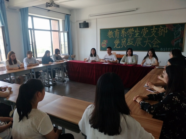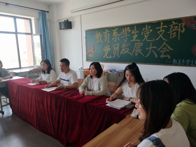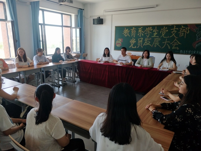 2019年6月15日10:00,教育系学生党支部在综合楼1322教室召开党员发展大会。参加本次大会的有教育系学生党支部书记柳志明同志、组织委员李扬同志、宣传委员崔馨月同志、教育系学生党员。