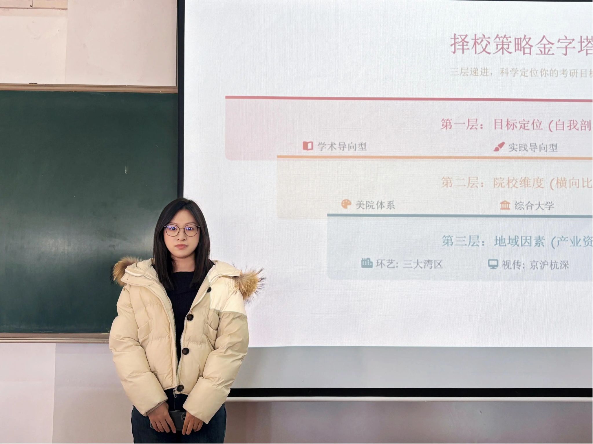会上,王可心老师围绕不同专业的考研择校策略与备战指南进行了深入讲解,并详细讲述环境设计、视觉传达设计两个专业的备考核心要素,为学生提供了清晰的学业规划路径。