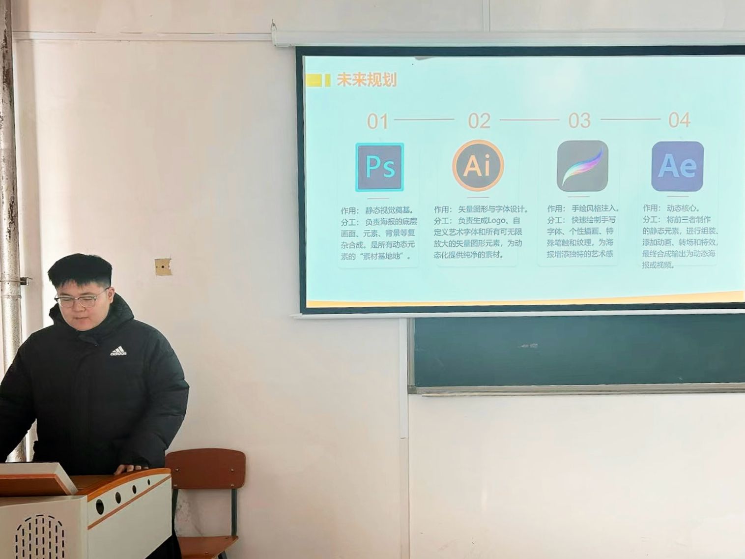 比赛现场,各战队依次登台进行作品展示与方案阐述。选手们围绕作品的视觉元素搭配、动态效果呈现、创意主题表达等核心内容展开详细讲解,从灵感溯源、主题确立到技术实现的全流程进行深入剖析,充分展现了扎实的专业基础与鲜活的设计思维。