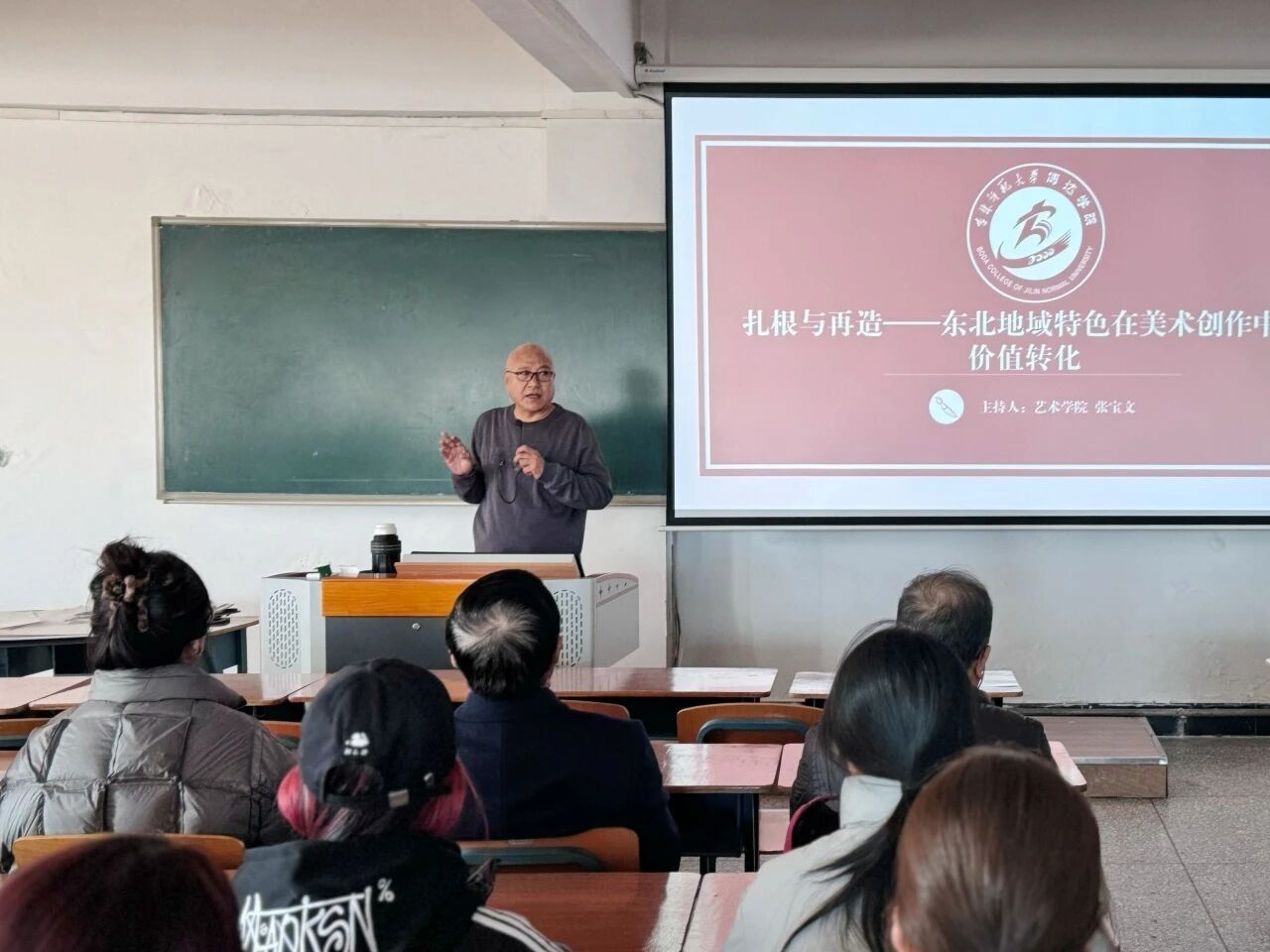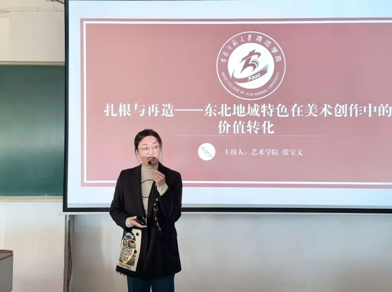 为深化新时代文化传承与创新发展,激发地域美术创作活力,吉林师范大学博达学院艺术学院于2025年11月13日下午在一教1501教室成功举办“扎根与再造——东北地域特色在美术创作中的价值转化”主题讲座。讲座由艺术学院院长助理李艳花老师主持,特邀美术学专业银龄教师张宝文副教授担任主讲。吉林师范大学博达学院副校长肖利教授及艺术学院部分师生出席。