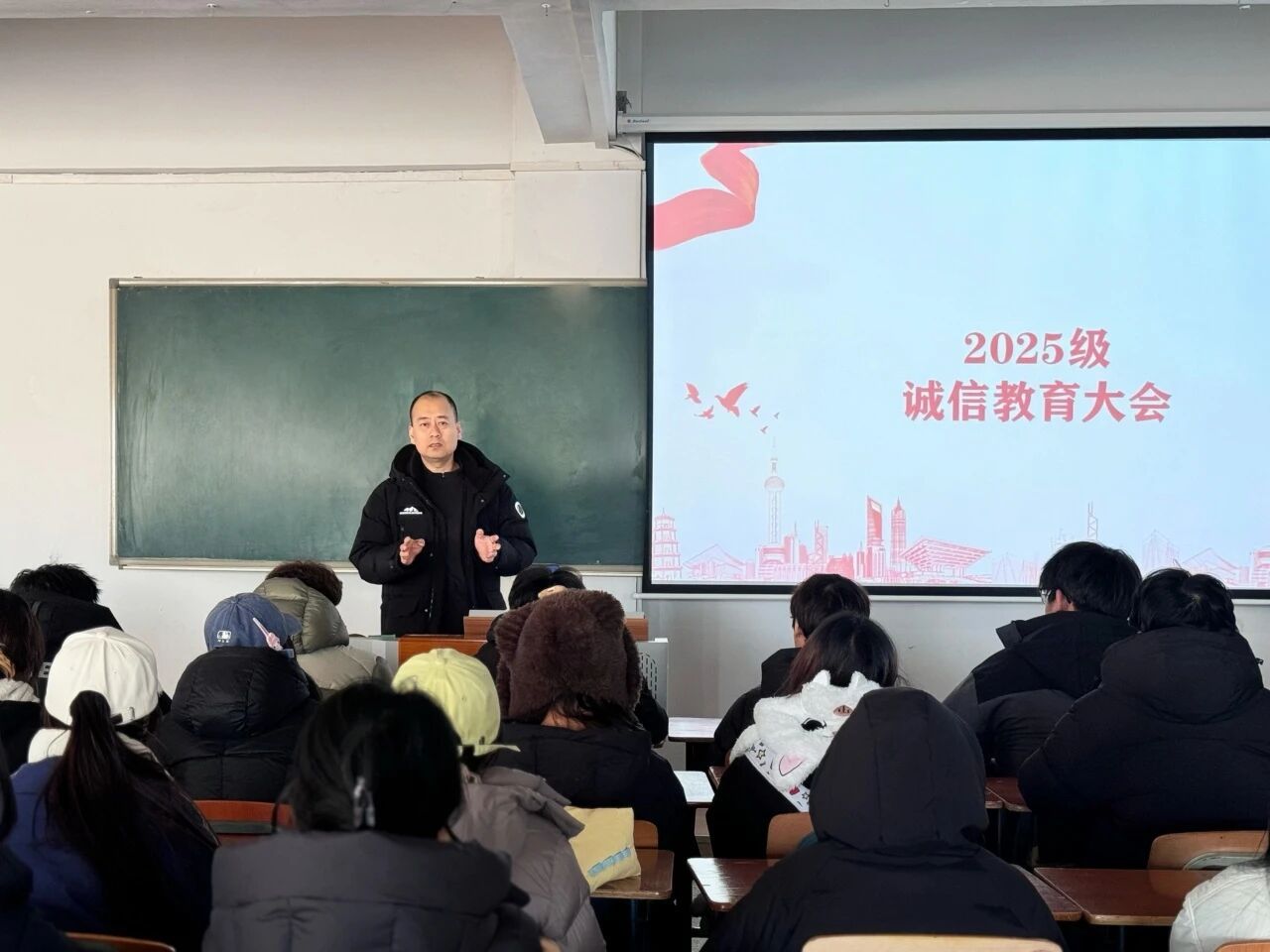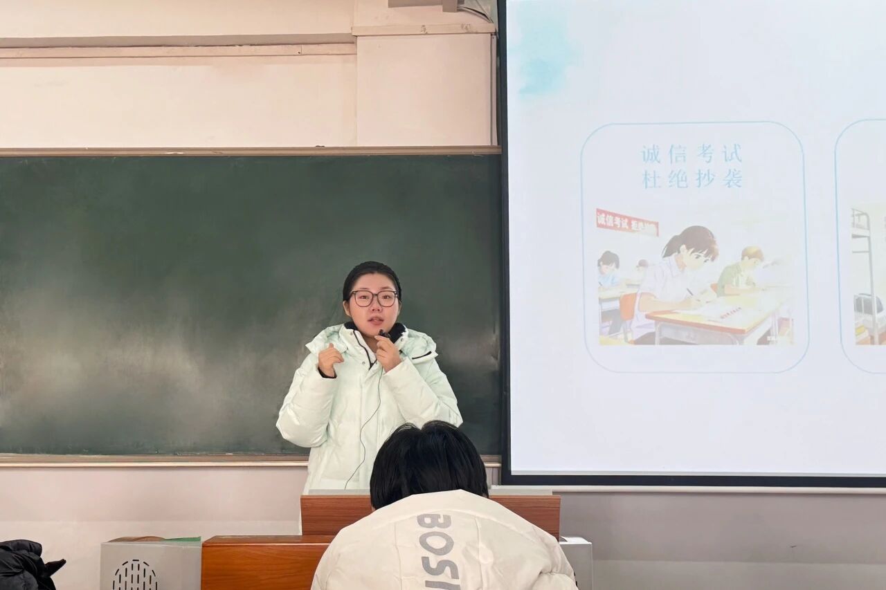 会上,王占利老师围绕诚信考试主题,深入阐述学术诚信的核心价值与考场纪律的严肃性。他强调,考试作弊是对公平公正的严重破坏,学院始终坚持“零容忍”态度,将依规严肃处理。同时呼吁同学们以端正态度迎接考试,用真实水平维护良好学风。