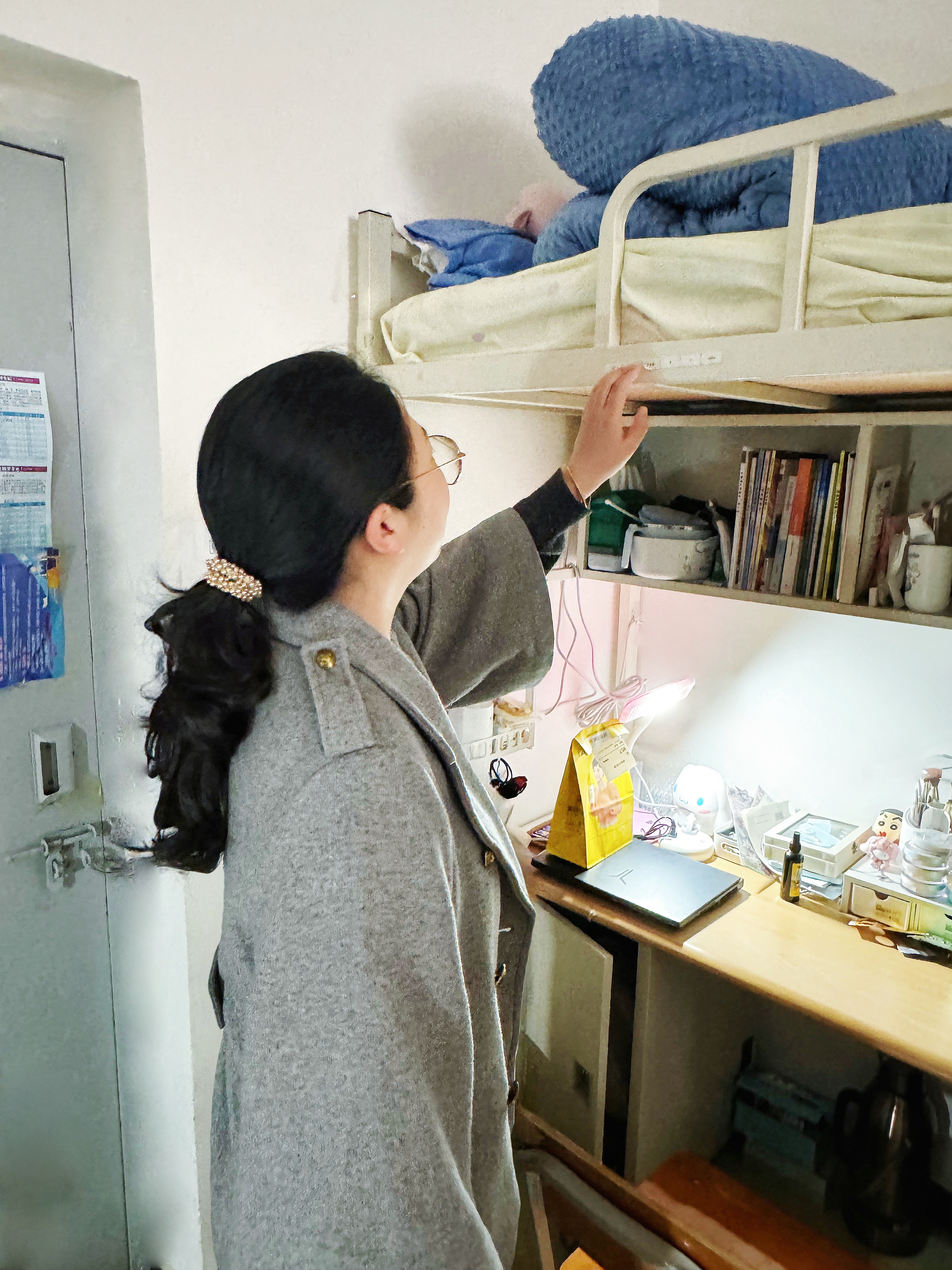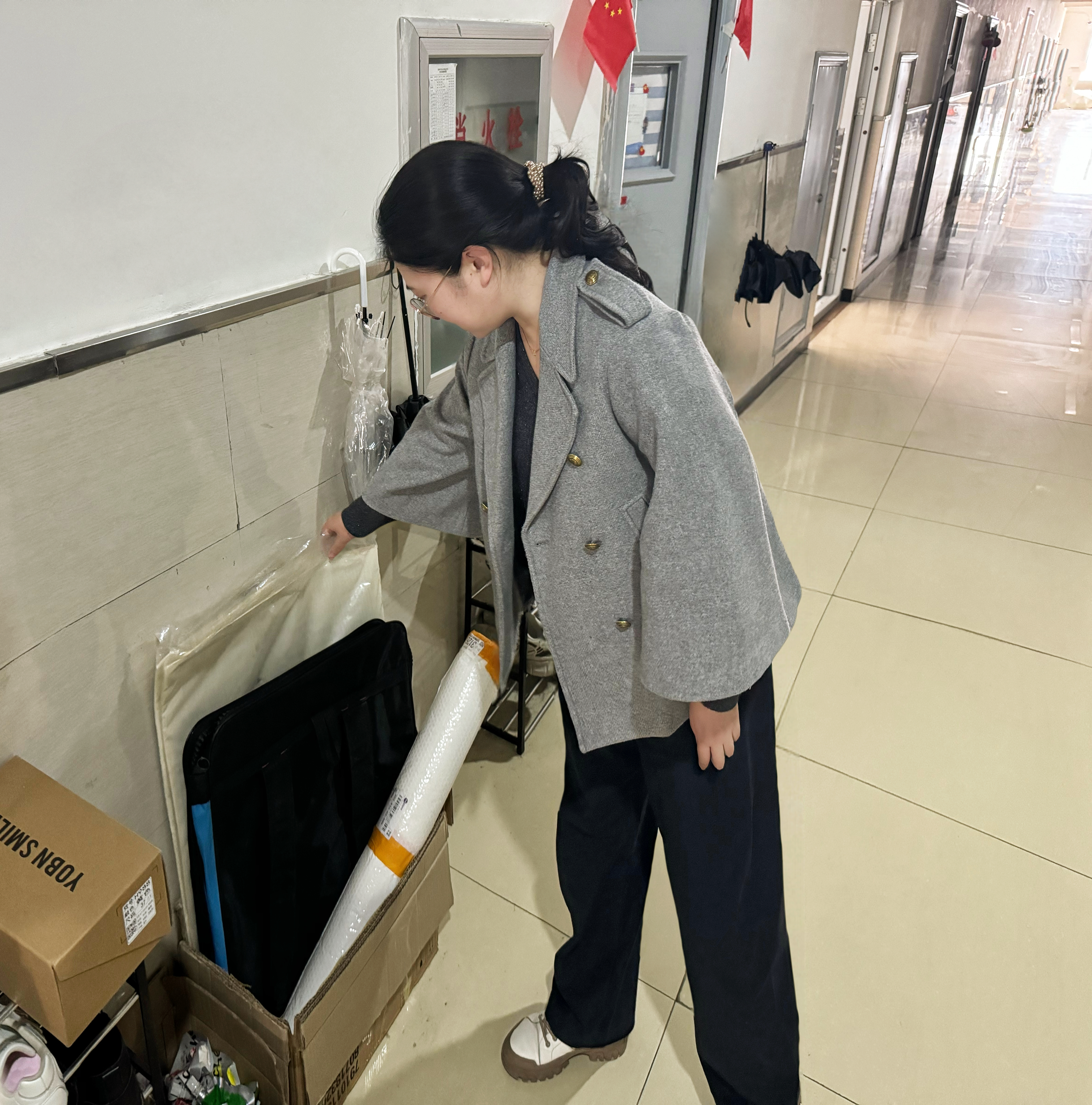 张维老师与王占利老师同步走访学生寝室与教室,针对不同场景提出对应的相关要求。在寝室检查中,老师们重点排查床铺整理、用电安全及卫生死角,针对床头悬挂衣物、插线板私拉乱接等问题现场示范整改标准。整洁的寝室能利于减少细菌的滋生,干净的寝室环境和温馨的生活氛围也为学生的健康提供了保障。