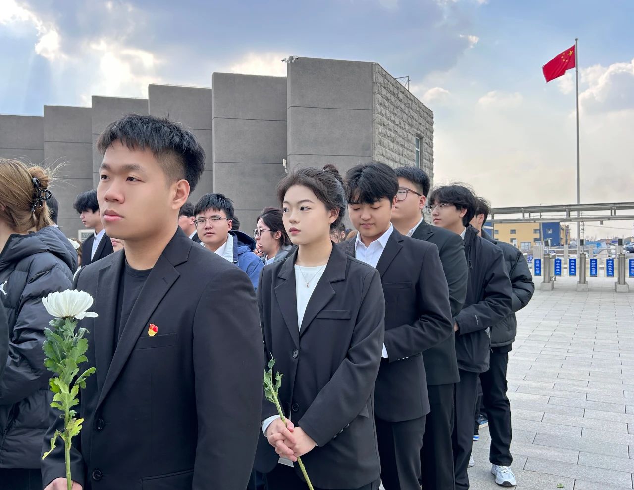 在庄严肃穆的烈士陵园中,讲解员带领大家深入陵园,深情讲述革命烈士的英勇事迹和陵园建设背后的感人故事。同学们整齐列队于纪念碑前,手持白花,神情凝重。