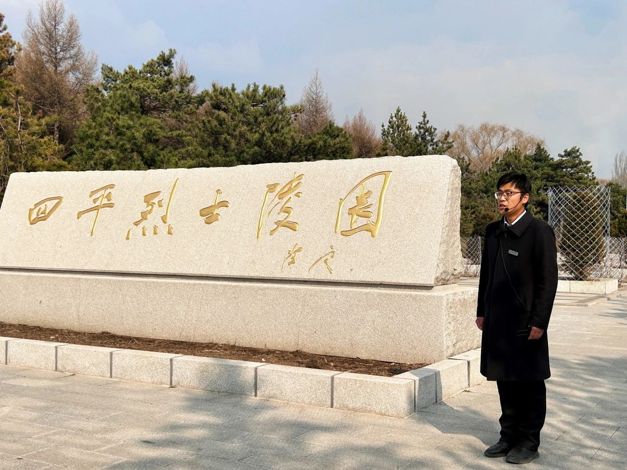活动中,全体同学在学工办副主任张维老师和辅导员王占利老师的带领下有序地进入烈士陵园。