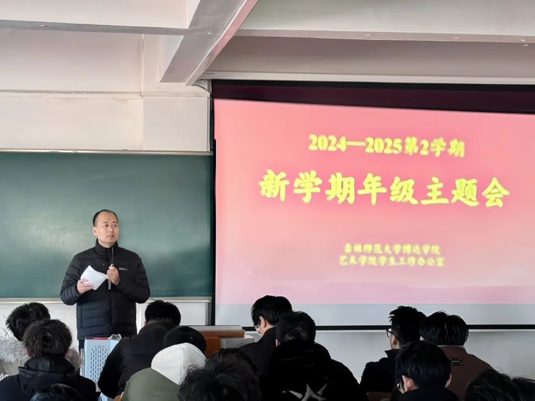 艺术学院于2025年3月5日下午14:30召开“2024-2025第二学期年级主题会”,会议由艺术学院辅导员王占利老师主持,艺术学校全体23级学生参加。
