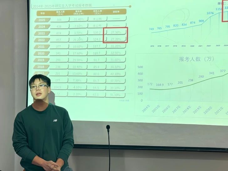 会议伊始,毕云龙老师介绍了近年来的考研情况,强调了提升学历在就业中的重要性,详细讲解了考研形式的变化对上岸率的影响,引导学生规划好合理的学习时间做到劳逸结合,也对考研院校的选择提出了建议,降低试错成本。