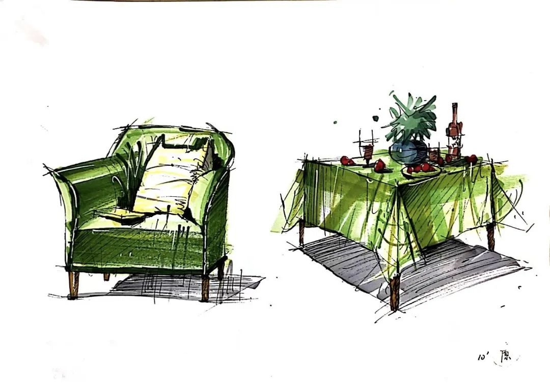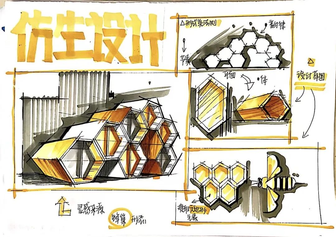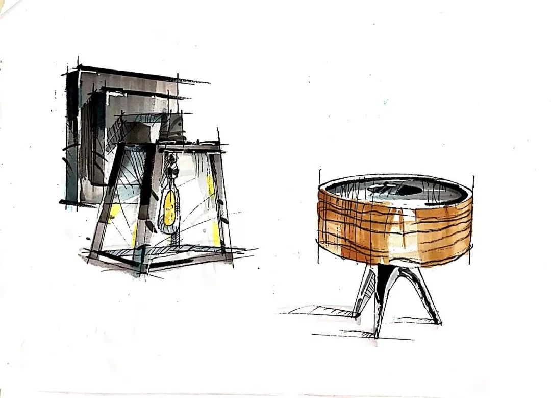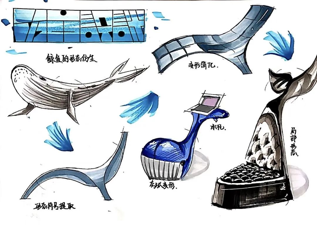 二等奖作品:手绘表现技法-家装单体的绘制:手绘表现是方案推敲思考的一个过程,在仿生方案设计的最初的是模糊的,不稳定的。面对设计思考过程中转瞬即逝的灵感,通过快速的手绘把这些灵感描绘下来,从而不断产生新的灵感创意。