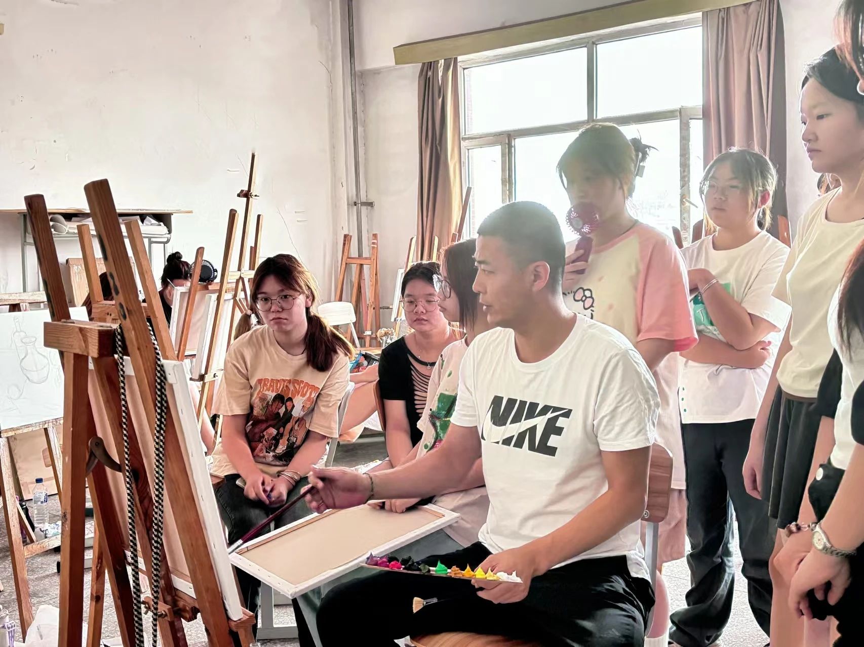 美术学(师范类)的画室中,油画写生课堂上空间与色彩的碰撞交织成一幅美丽画卷。学生们围绕着静物台,有的细致描绘水果的质感,有的大胆运用色彩表现光影变化。教师在画室中穿梭,不时驻足指导,鼓励学生们尝试不同的表现技法,激发他们的艺术灵感。