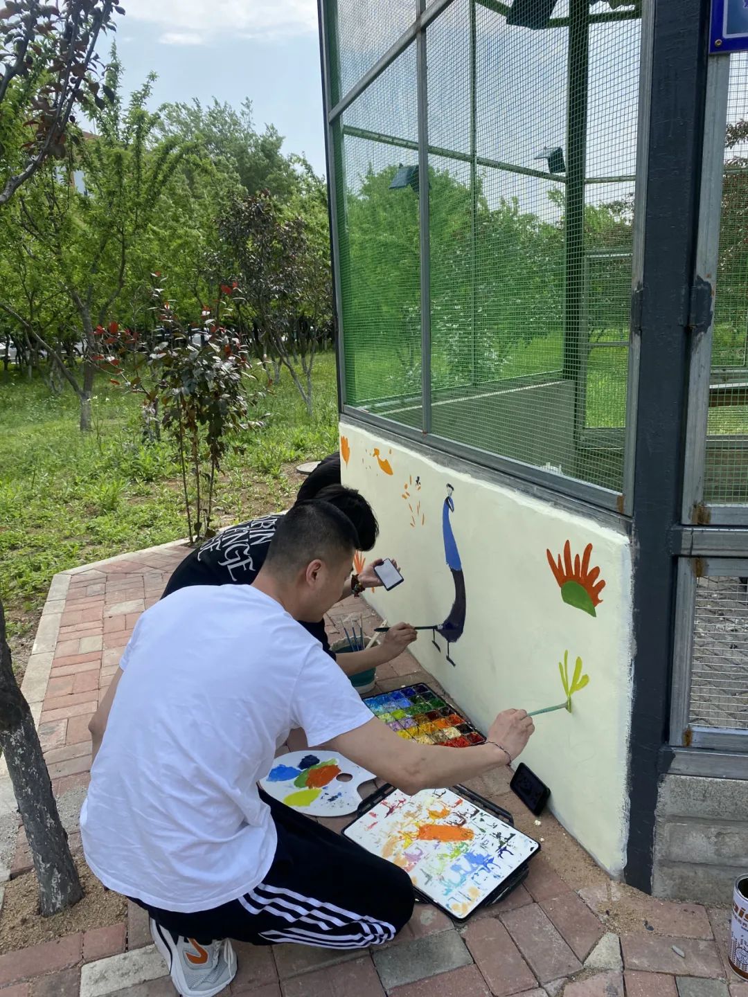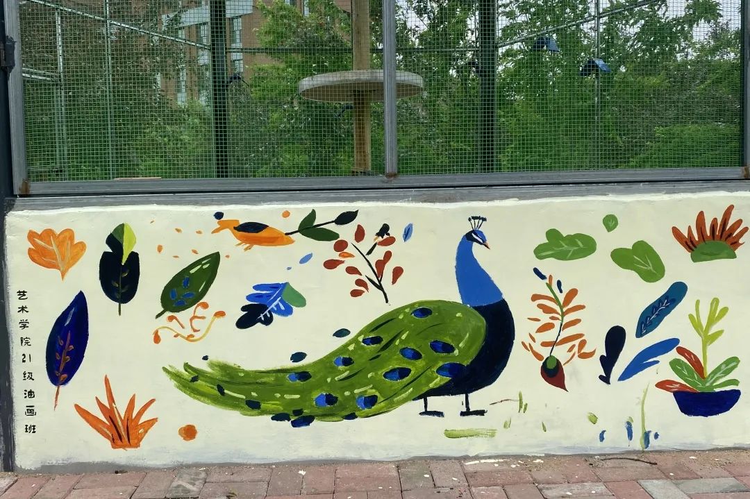 同学们在张大勇老师的指导下,充分发挥自己的专业所长,为孔雀园的墙面绘制色彩绚丽的图画。他们以“孔雀”为元素,结合学院特色和周围环境,有条不紊的进行着墙面绘画,起型,局部上色,勾画轮廓线,细节塑造。最后,由王湛迪老师在墙面提字,丰富多彩的绘画,让原本单调的墙壁变成艺术感十足的“打卡点”。