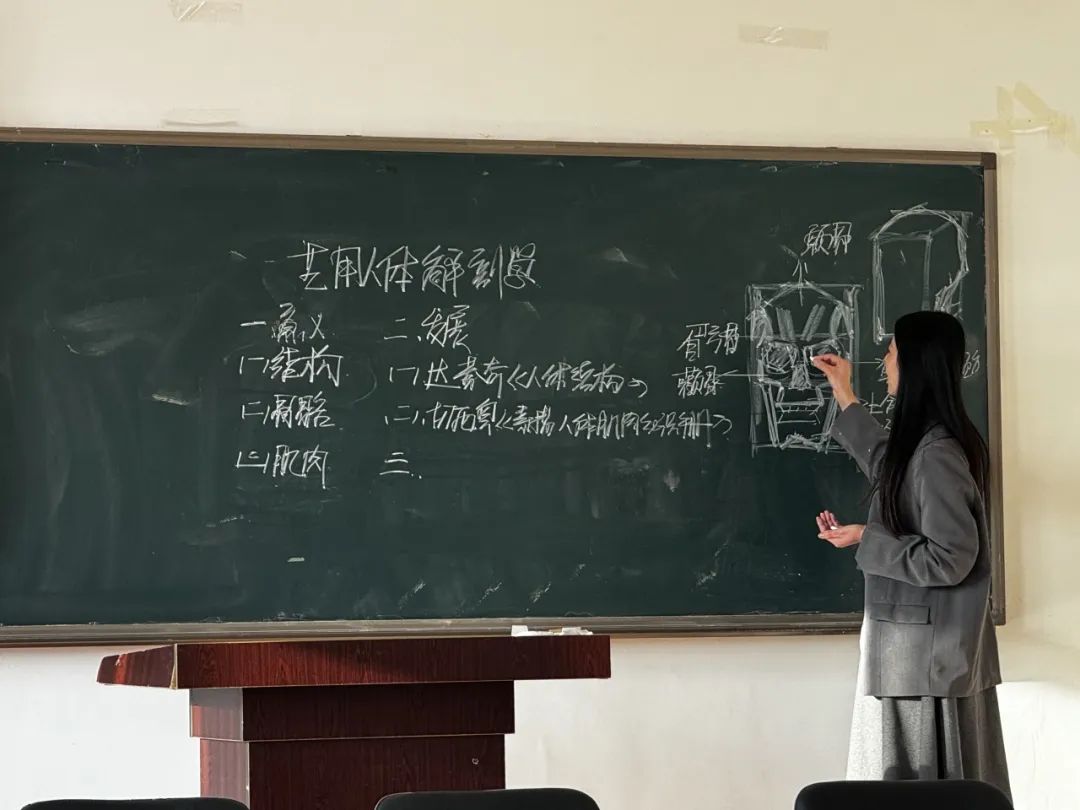 在新课试讲过程中,美术学专业洪玉晗老师讲解艺用人体解剖学,课程围绕头颅结构、骨骼和肌肉讲述了艺用人体解剖学意义并运用达芬奇«人体结构»等书籍展开讲解。