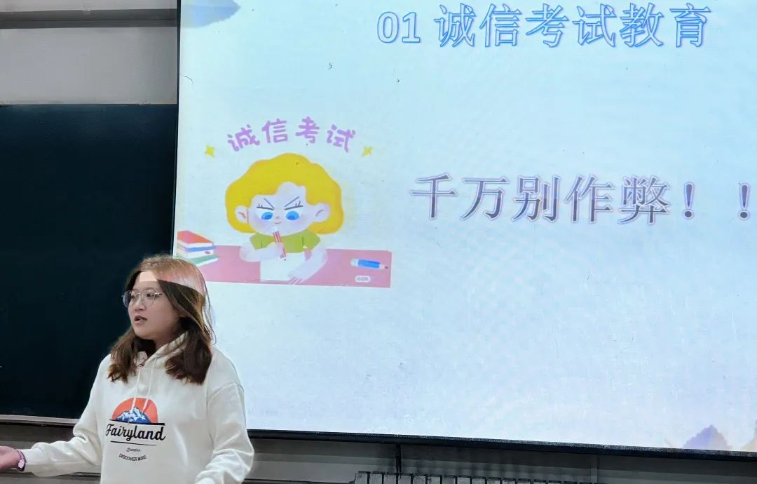 会议伊始,郑焱老师向同学们提出了禁止携带与考试内容相关的材料或存储相关考试内容的电子设备进入考场;抄袭或协助他人抄袭试题答案或与考试内容相关的资料;由他人冒名顶替参加考试或在答卷上填写与本人身份不符的姓名、考号等信息等违规行为的出现并着重强调学校对于考试舞弊行为的严肃态度和重点打击,点明了诚信考试的重要性,告诫同学们要严肃对待考试,遵守考试规则,自觉维护考场秩序,展现自己真实水平,诚信考试、诚信做人。