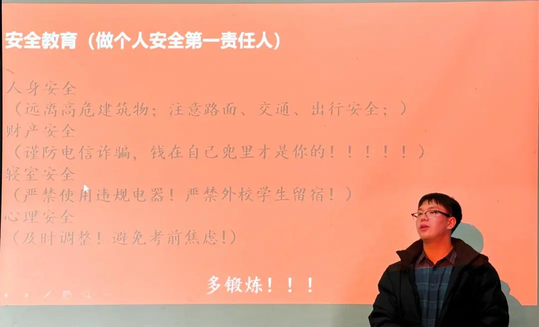 会议伊始,毕云龙老师讲述了人身安全、财产安全、寝室安全、心理安全等安全教育内容,他表示,应时刻牢记 “安全第一,生命至上”的安全观念,积极主动地增强自己的安全防范意识,保证自己身心健康地完成学业。