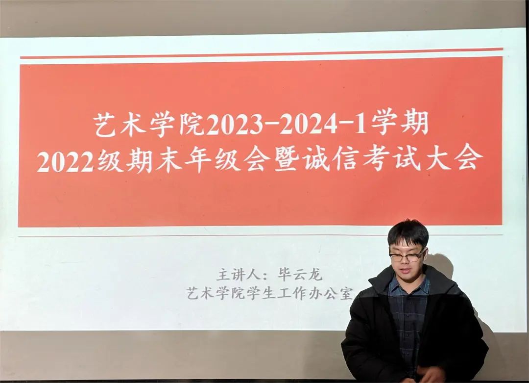 为推进学风建设,严肃考风考纪,进一步提升学生诚信意识和自我约束能力。12月6日下午14:00,艺术学院于老校区第二教学楼2202召开院2023-2024-1学期2022级期末年级会暨诚信考试大会,会议由艺术学院学工办副主任毕云龙老师主持,2022级全体同学参加此会议。