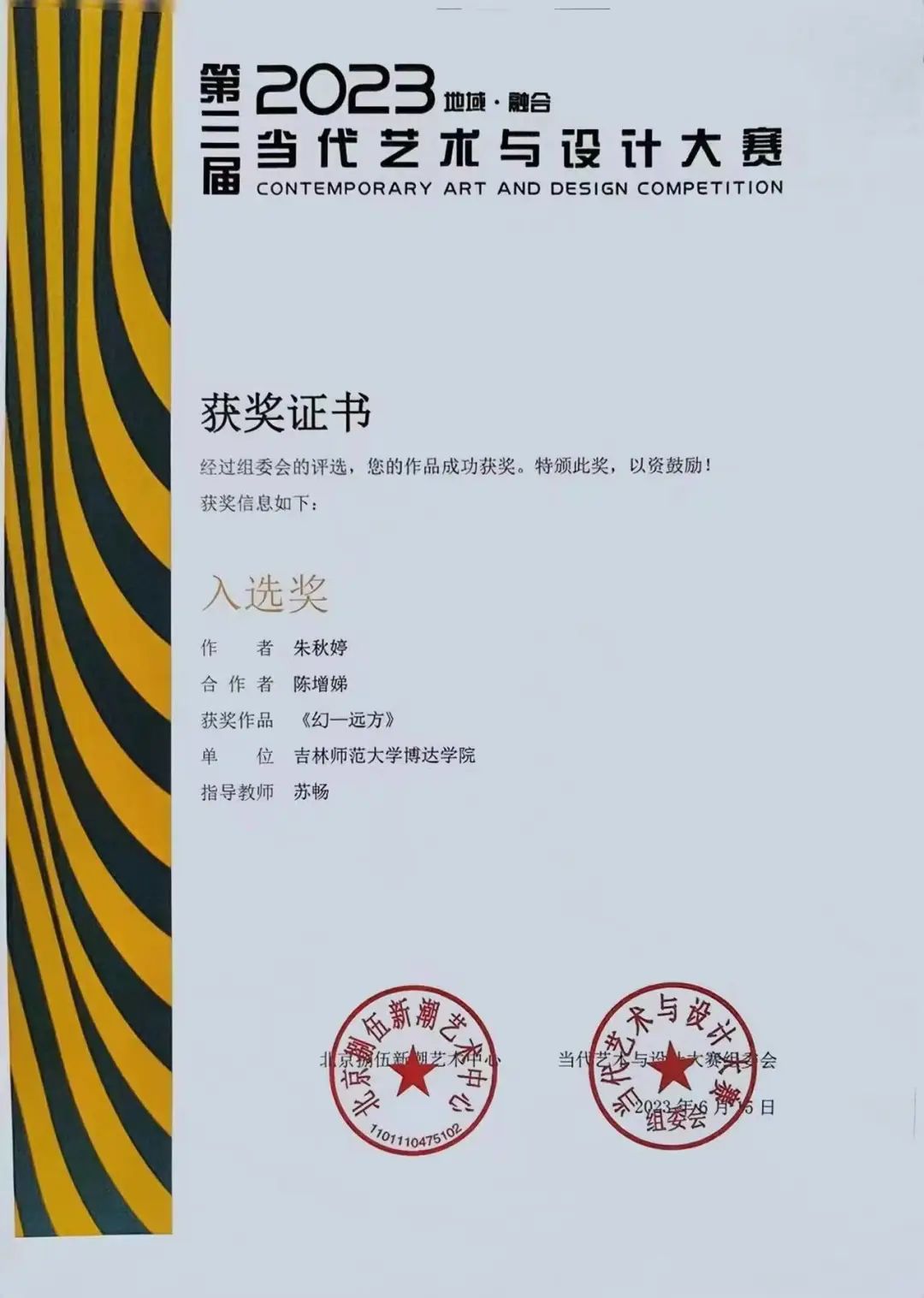 朱秋婷,陈增娣两位同学创作的《幻一远方》在2023第三届当代艺术与设计大赛中荣获入选奖。