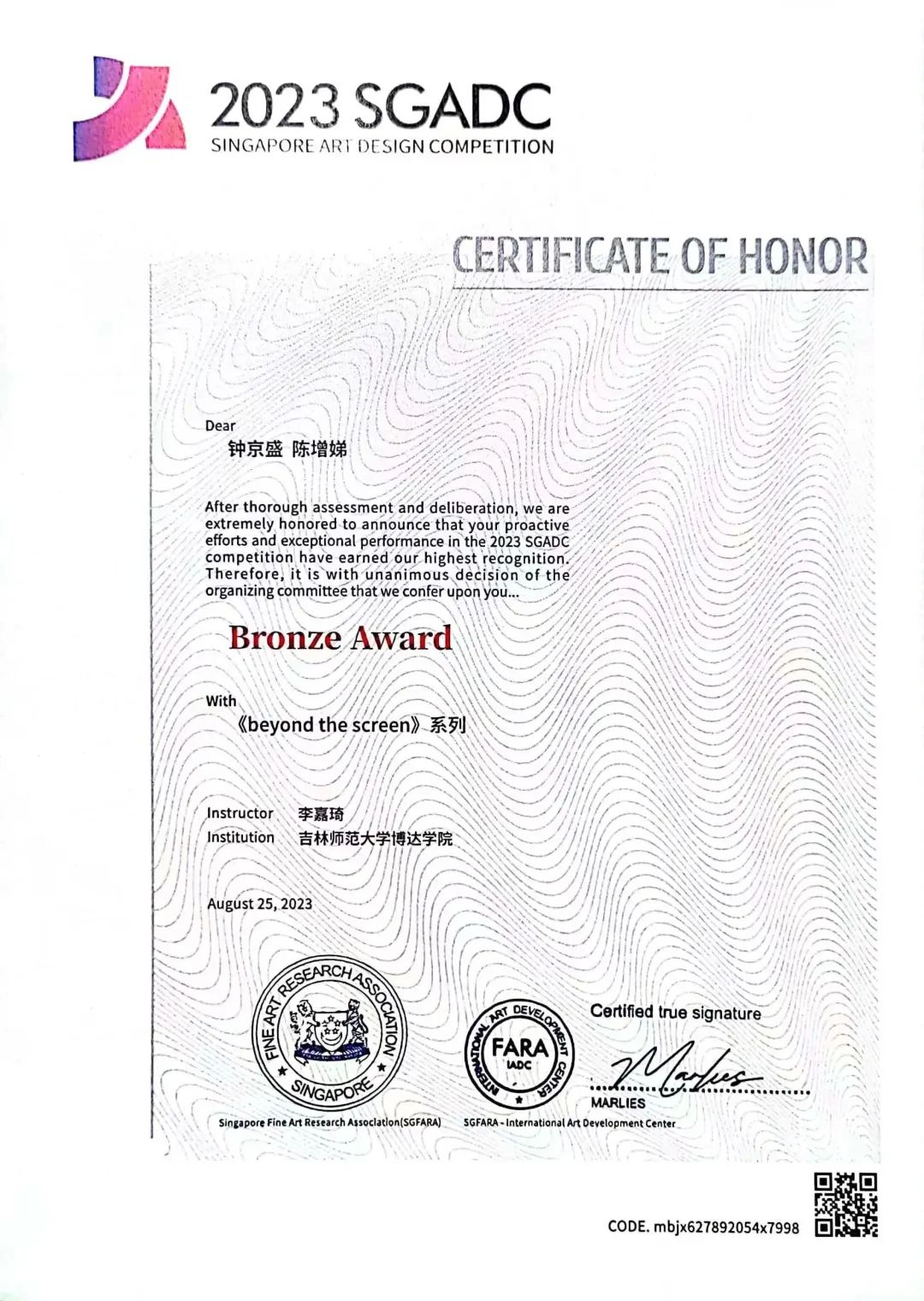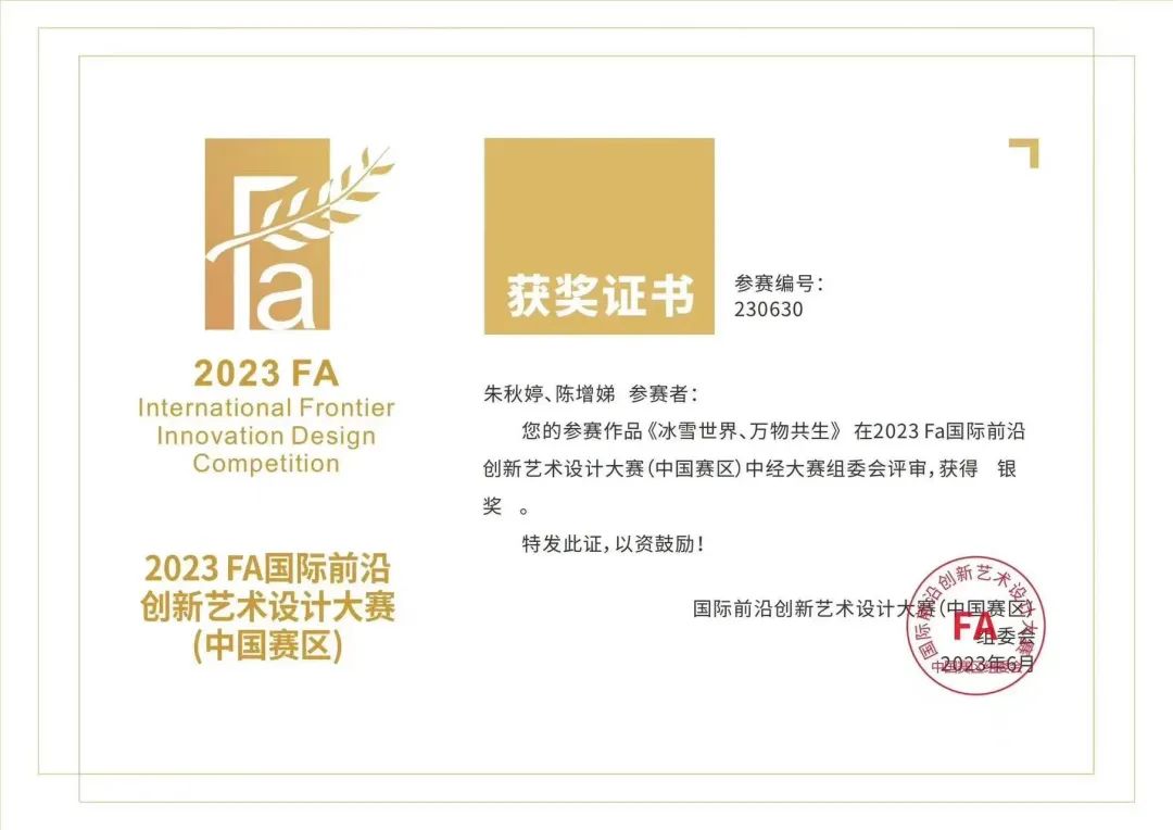 在“2023 FA国际前沿创新艺术设计大赛”中,朱秋婷、陈增娣两位同学创作的《冰雪世界、万物共生》荣获银奖,《俄罗斯风情》、《渔见渔民画》两个作品荣获入选奖。