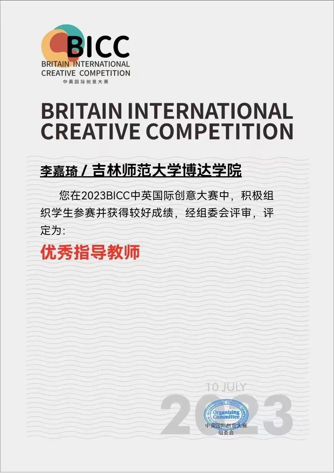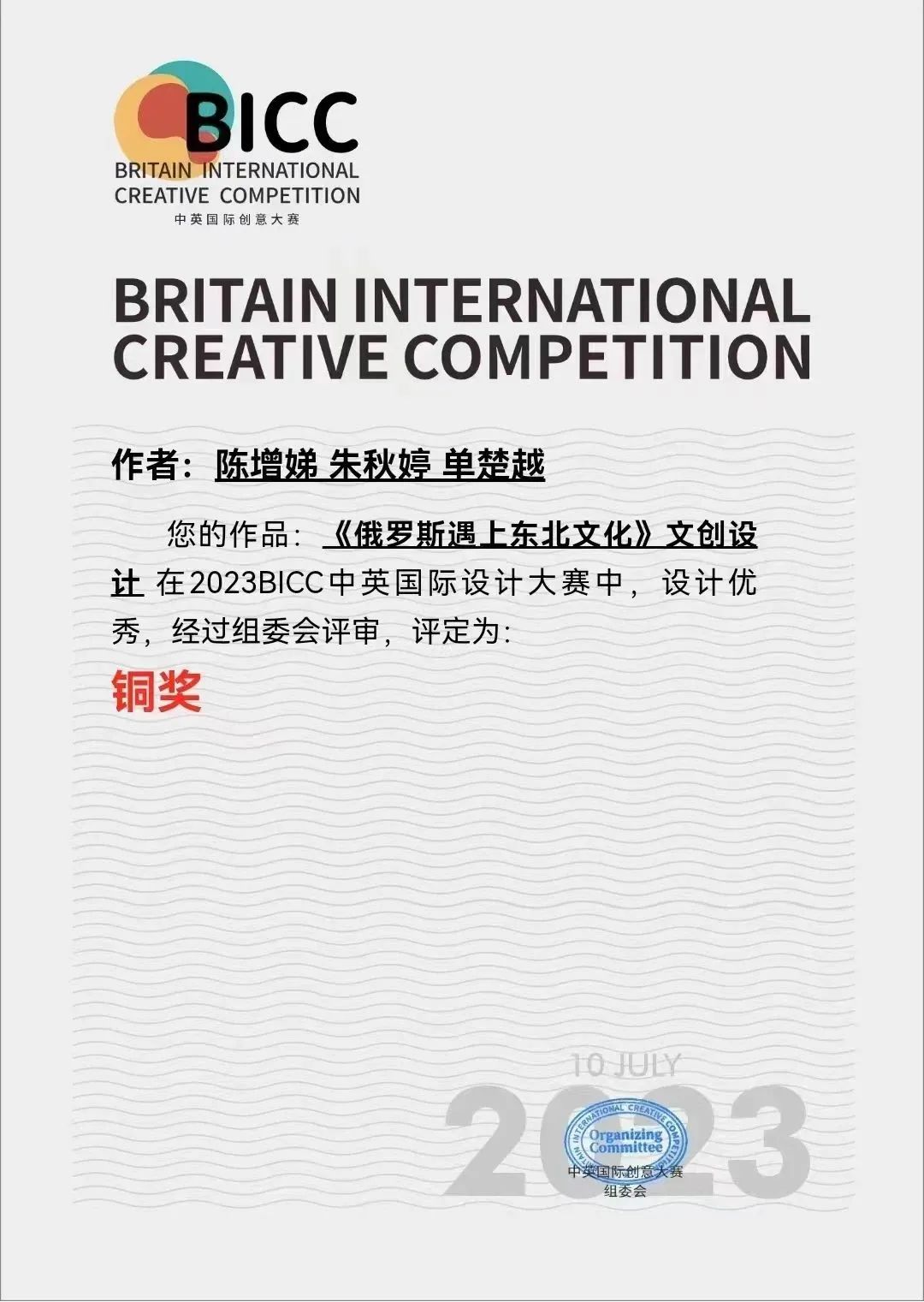 在2023BICC中英国际设计大赛中,陈增娣同学、朱秋婷同学、单楚越同学的作品《俄罗斯遇上东北文化》文创设计获得铜奖。