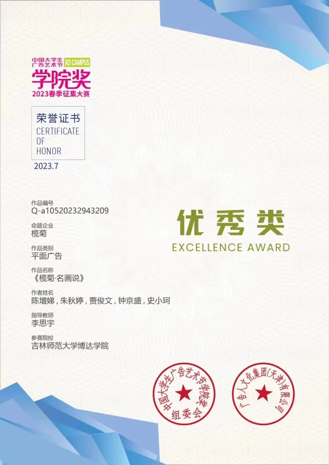 陈增娣,朱秋婷,贾俊文,钟京盛,史小珂五位同学的作品《榄菊·名画说》在2023年大学生“广告艺术节学院奖”设计大赛中获得优秀类。