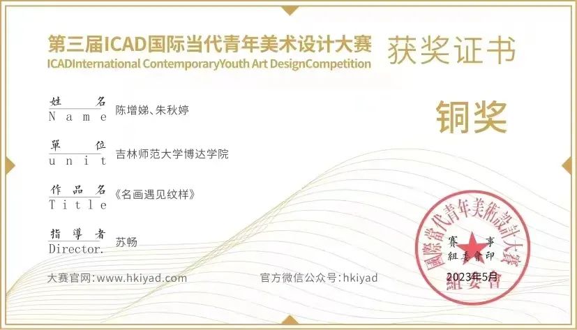 陈增娣,朱秋婷两位同学创作的《名画遇见纹样》在第三届ICAD国际当代青年美术设计大赛中荣获铜奖。