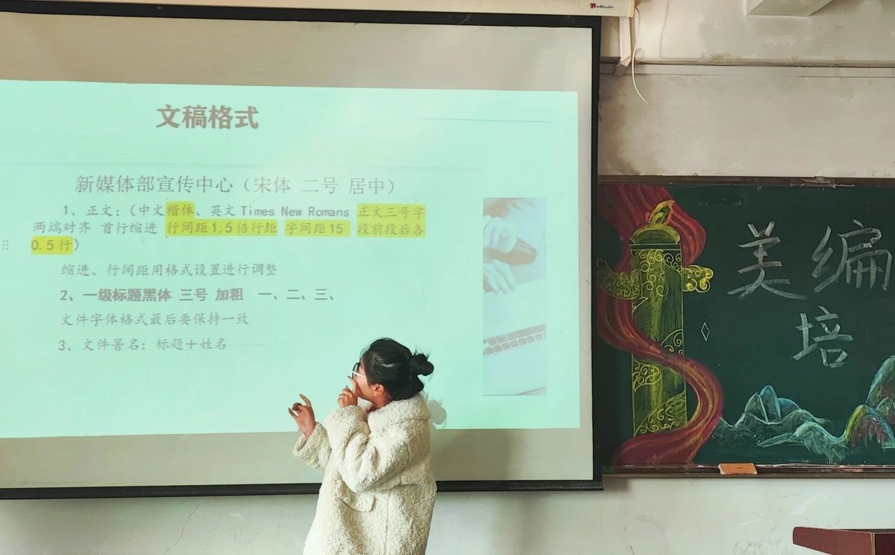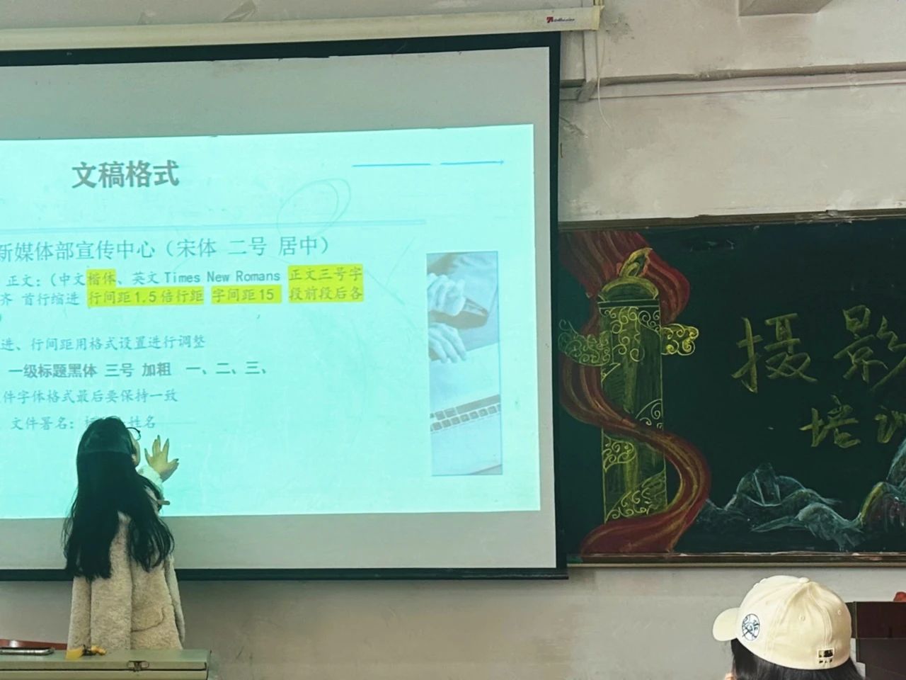 随后,各部门部长介绍各部门的工作内容,以PPT的形式讲解各部门担任的工作职责,并详细说明在工作时需要注意的格式内容。指出文章内容的编写要求字体统一、格式正确,并且在写作完成后要对稿件进行整体审阅,保持文章的和谐性与整体性;介绍了秀米等排版工具的使用规范,并通过实际操作告诉大家使用此类工具制作微信推送的流程与方法;对摄影构图的规范以及对图片后期处理的要求、绘画板报以及设计封面海报时的正确规范进行了一一阐述。