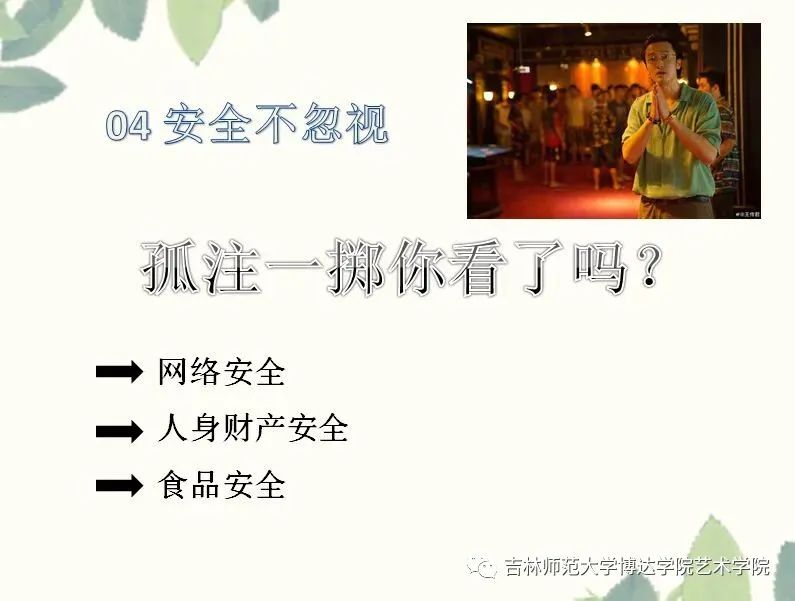 会上着重强调,继续严格实行《缺课登记追踪制度》以及日常请假制度;晚点名寝室长上报制;严禁未经审批擅自校外住宿,注重寝室用电安全,严禁使用违规电器;注意网络安全、严防电信诈骗、注意人身财产安全、关注食品安全等。