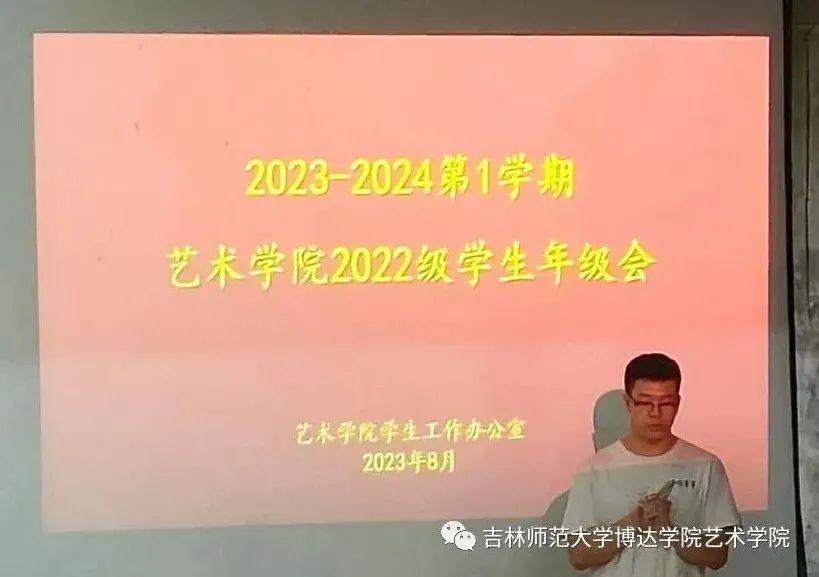为培养学生良好的学习作风与生活习惯,保障学院各项工作顺利平稳进行,艺术学院“2022级秋季学期年级会”在二教2202教室顺利召开。会议由辅导员毕云龙老师主持,2022级全体学生参加。