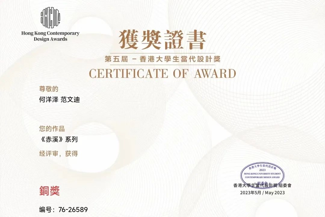 2023年5月,在由香港美术设计协会、香港美术艺术研究院主办的第五届香港大学生当代设计奖中多幅作品入选并获得国家级银奖、国家级铜奖;