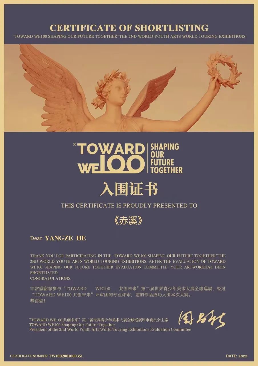 2022年3月,在由国际奥艺委员会、国际联合倡议多边合作组织发起,意大利国家教育部、意大利国家艺术学校网、恩佐罗西国立艺术学院协助发起的“TOWARD WE100 | 共创未来——第二届世界青少年美术大展全球巡展”中多幅作品入选;