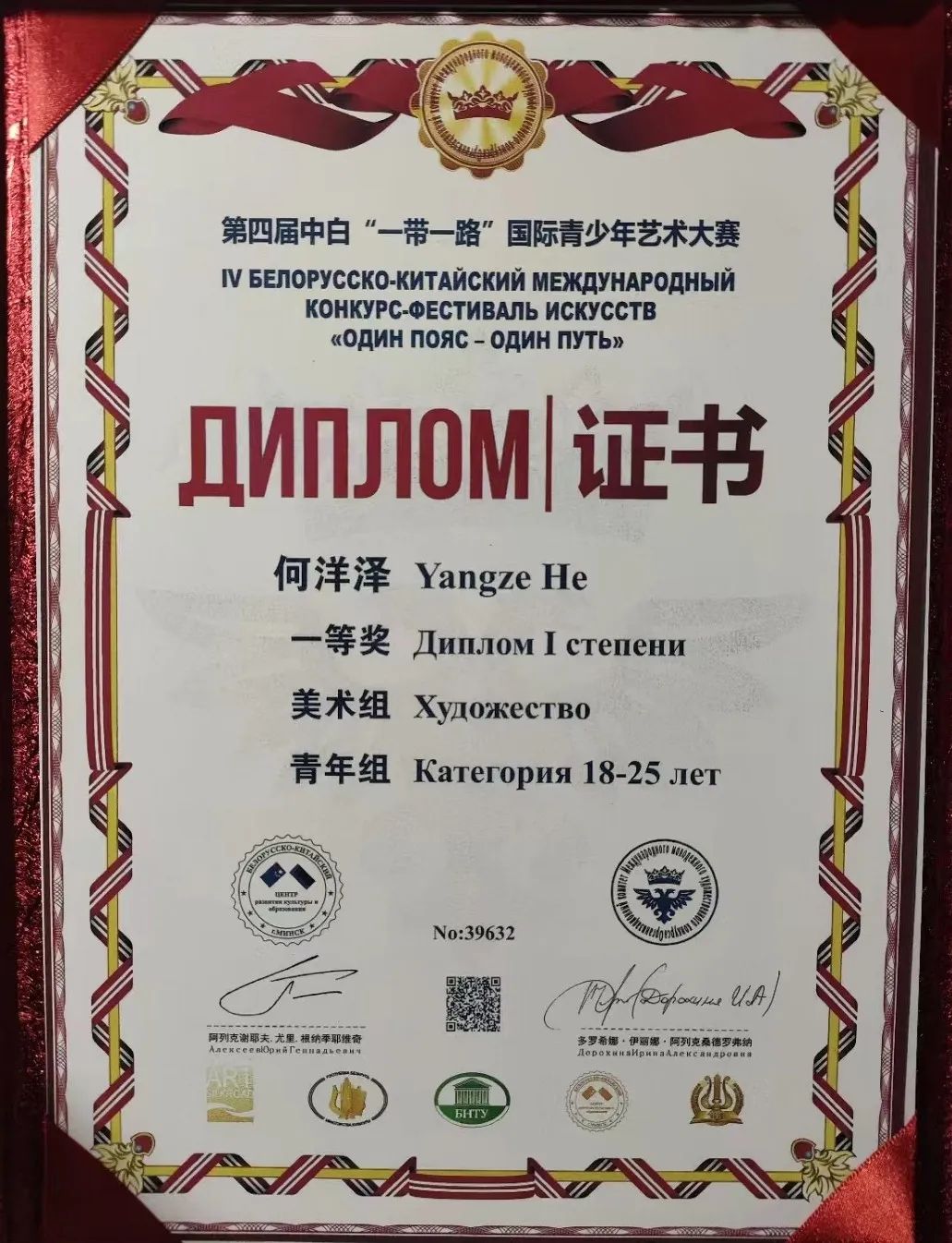 2023年1月,在由白俄罗斯共和国文化部、白俄罗斯共和国教育部、白俄罗斯明斯克市政府主办的第四届中“一带一路”国际青少年艺术大赛”并获得国际级金奖;
