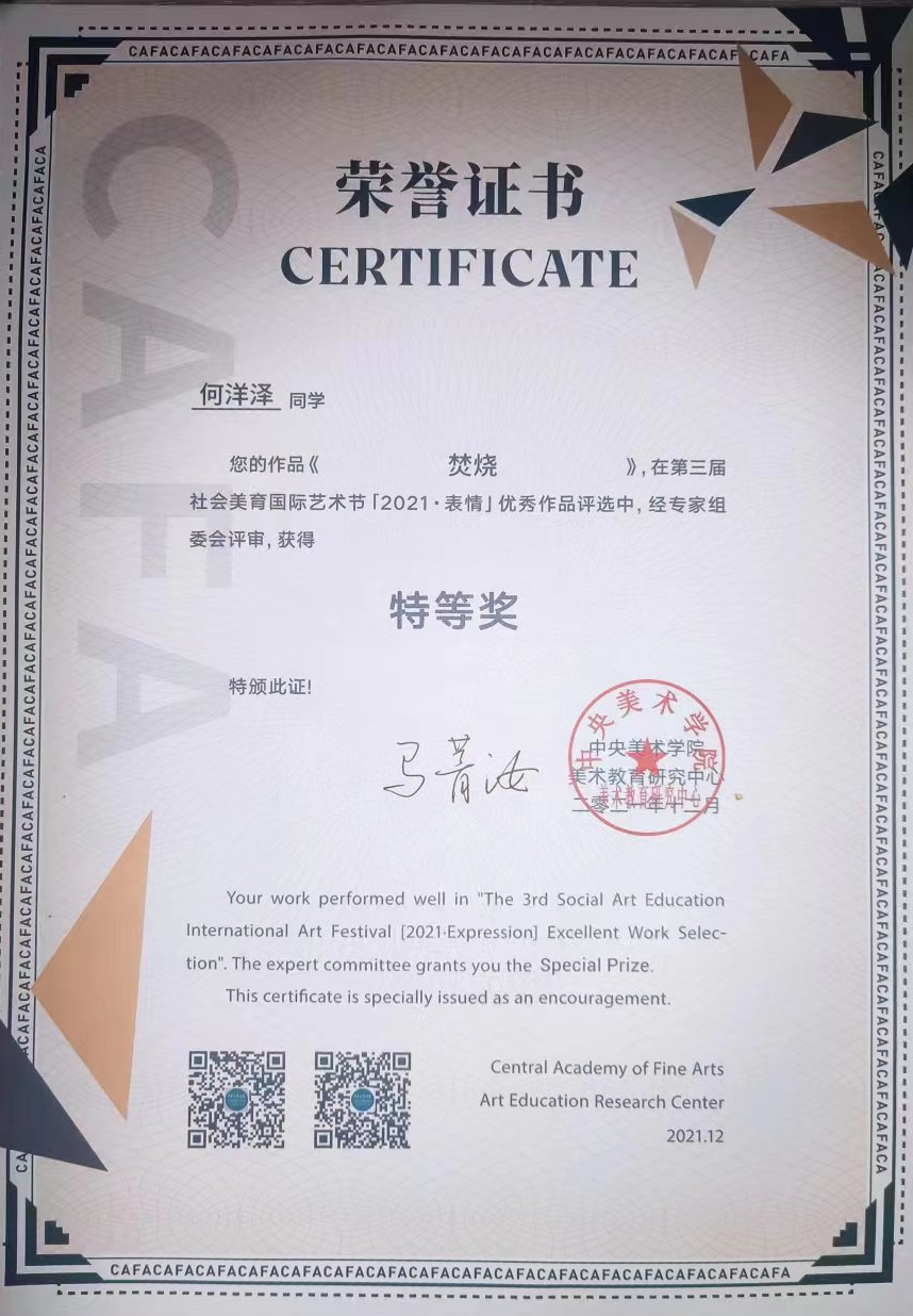 2021年12月在由中央美术学院美术教育研究中心、湖南美术出版社、北京靳尚谊艺术基金会主办的第三届社会美育国际艺术节“2021·表情”优秀作品中获得特等奖;