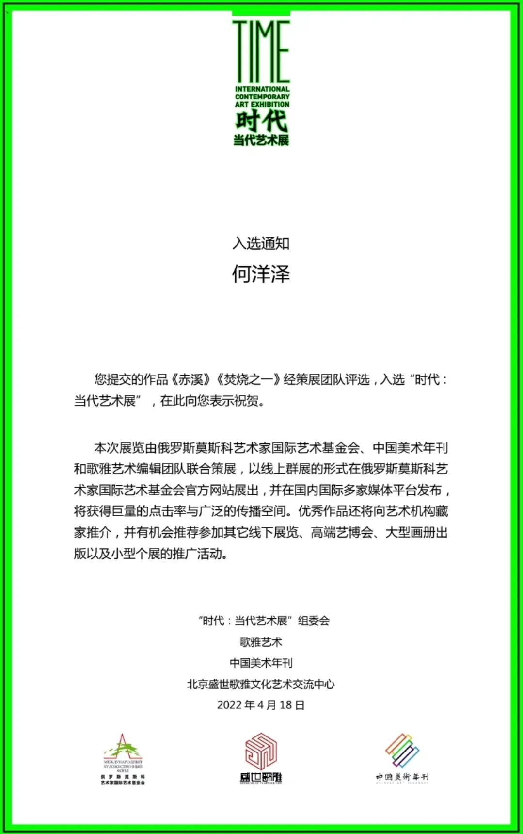 2022年5月,在由俄罗斯莫斯科艺术家国际艺术基金会、中国美术年刊和歌雅艺术主办的时代: 当代艺术展中多幅作品入选;