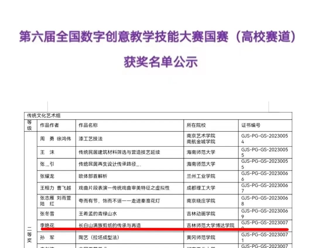 近日,第六届全国数字创意教学技能大赛国赛(高校赛道)获奖名单揭晓,艺术学院美术学专业主任李艳花副教授参赛作品《长白山满族剪纸的传成与再造》获得传统文化艺术组“二等奖”。