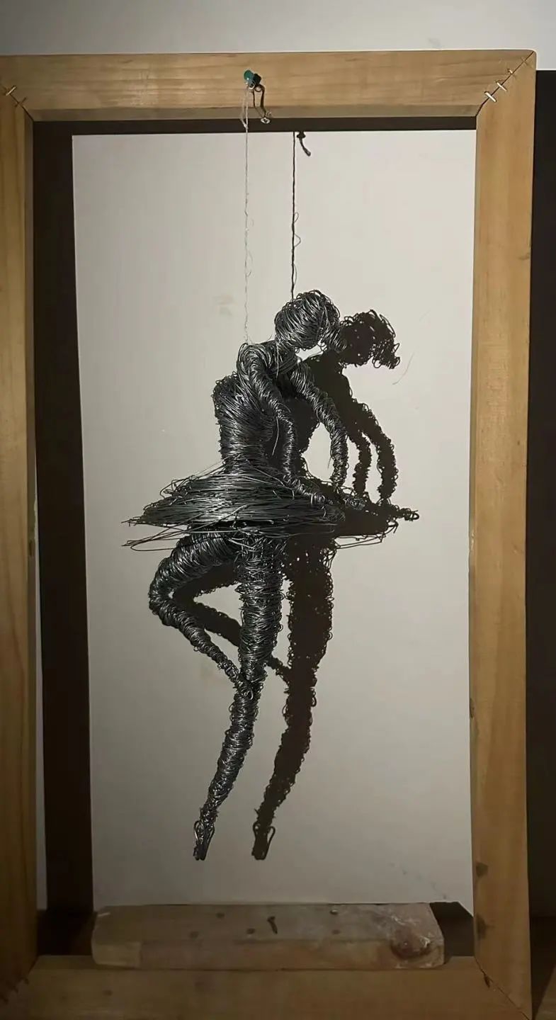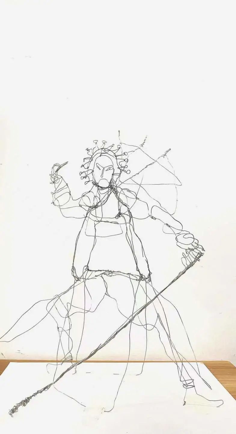 这个作品是由铁丝环绕缠绕而成的。先做成人体的框架骨头,经过大量铁丝的缠绕,由铁丝来组成人体的肌肉、头发、裙子等等部位。