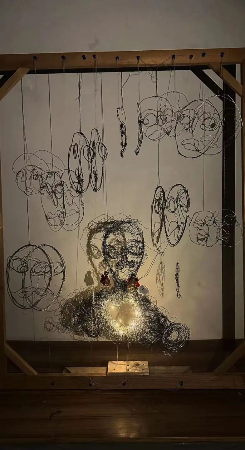 这幅作品我用到的材料有铁丝图钉、 线、 灯。在生活中我们有各种各样的情绪 ,有喜怒哀乐,各种生活的态度。但是要以乐观的心态去面对生活。坚持自己本身的梦想。