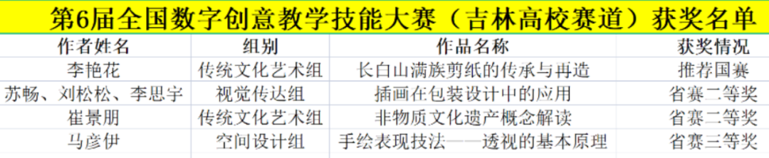 2023年4月19日,中国好创意暨全国数字艺术设计大赛官网发布了第六届全国数字创意教学技能大赛吉林赛区 (高校赛道) 获奖结果,李艳花推荐进入国赛,崔景朋、苏畅(刘松松、李思宇)荣获省赛二等奖,马彦伊荣获省赛三等奖。