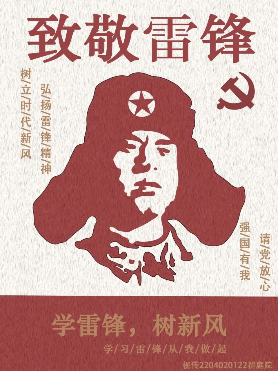 视觉传达设计学子们充分发挥专业优势,深刻理解雷锋精神的时代内涵,制作“雷锋精神”宣传海报。用艺术作品声援红色精神,将雷锋精神落实到学习生活中,响应当代大学生对雷锋精神的敬仰!