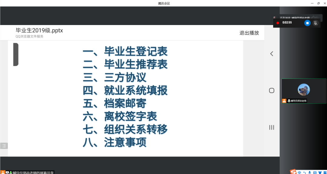会议伊始,辅导员郑焱老师对毕业生登记表、毕业生推荐表、三方协议、就业系统填报、档案邮寄、离校签字表、组织关系转移及注意事项八项内容做了相关的解答,其中,对简历的完善修改、就业信息的获取、三方协议签署需注意的事项等进行了详细的介绍。