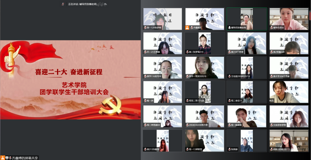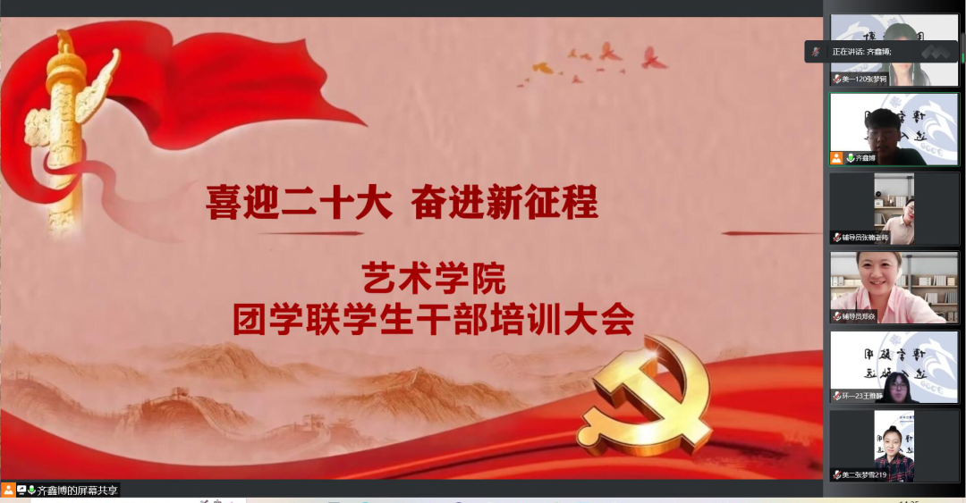 为更好地培养艺术学院团学联学生干部的综合素质能力,打造一支热情为同学服务的学生干部群体,艺术学院于2022年9月7日下午举行了学生干部线上培训会议。艺术学院学工办主任张楠老师、辅导员郑焱老师、以及团学联学生干部出席了会议。