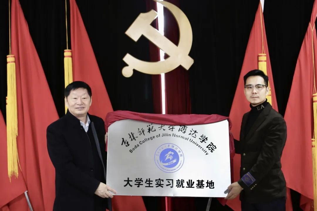 吉林师范大学博达学院执行校长王国军与吉林行人教育集团董事长李明昕出席两校深度合作签约仪式。
