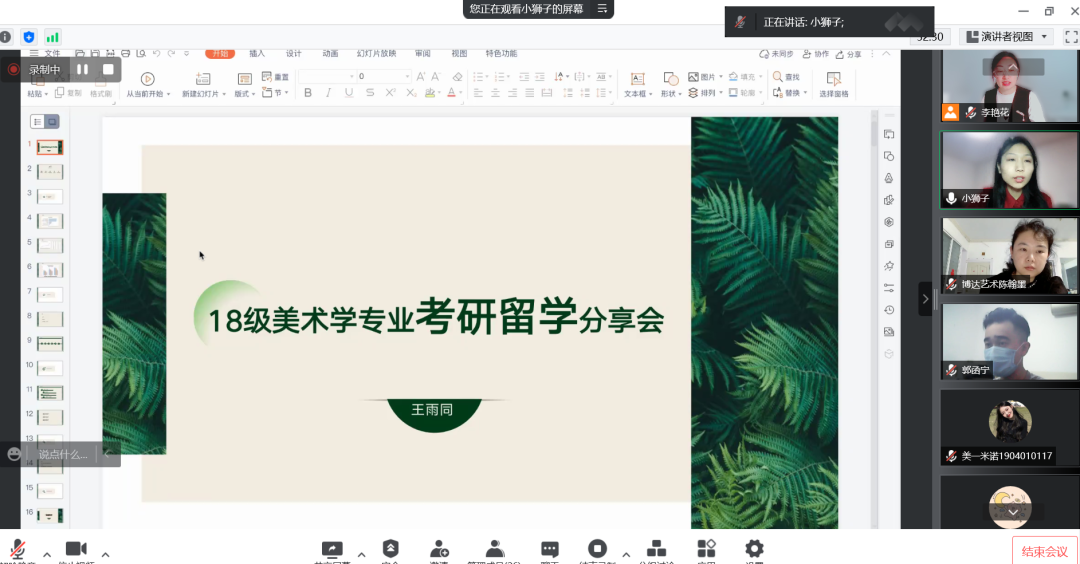 会议伊始,由美术学国画专业王雨同老师做考研留学情况介绍及分析,首先介绍了目前近几年国内考研及留学的情况,展示了不同学历的薪资待遇,强调了考研的必要性,同时也详细介绍了美术学专业考研的方向与具体考试内容。