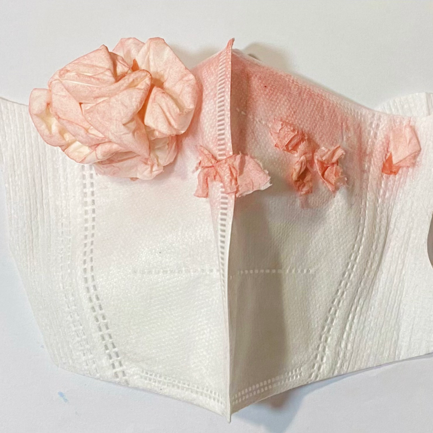 设计说明:本作品以花为主题,右脸颊以一朵花突出主体,春来无事只为花忙,口罩撒点腮红,撒点“花瓣”,看似随意,来自平常最随意不过的小东西,通过巧妙的手法,赋予春的希望,一切变得有趣起来。
