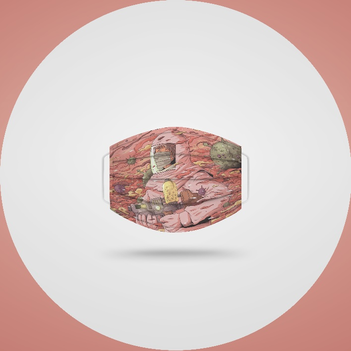 设计说明:作品以福农大红会的吉祥物农小红以及会徽为主要构成元素,赋予该作品独特的标志性,其中左半边为身着白衣,心有锦缎的白衣战士,以渐变蓝为底色,象征着永恒纯洁无私,右半边是以爱传播爱的农小红,以渐变粉为底色,展现出红十字满满的温暖与爱,两边共同凸显出红十字精神“人道、博爱、奉献”。整幅作品需以“3D”立体口罩的形式展现,由此更能体现出作品左右侧鲜明的风格以及中心部分力量与爱的汇融。