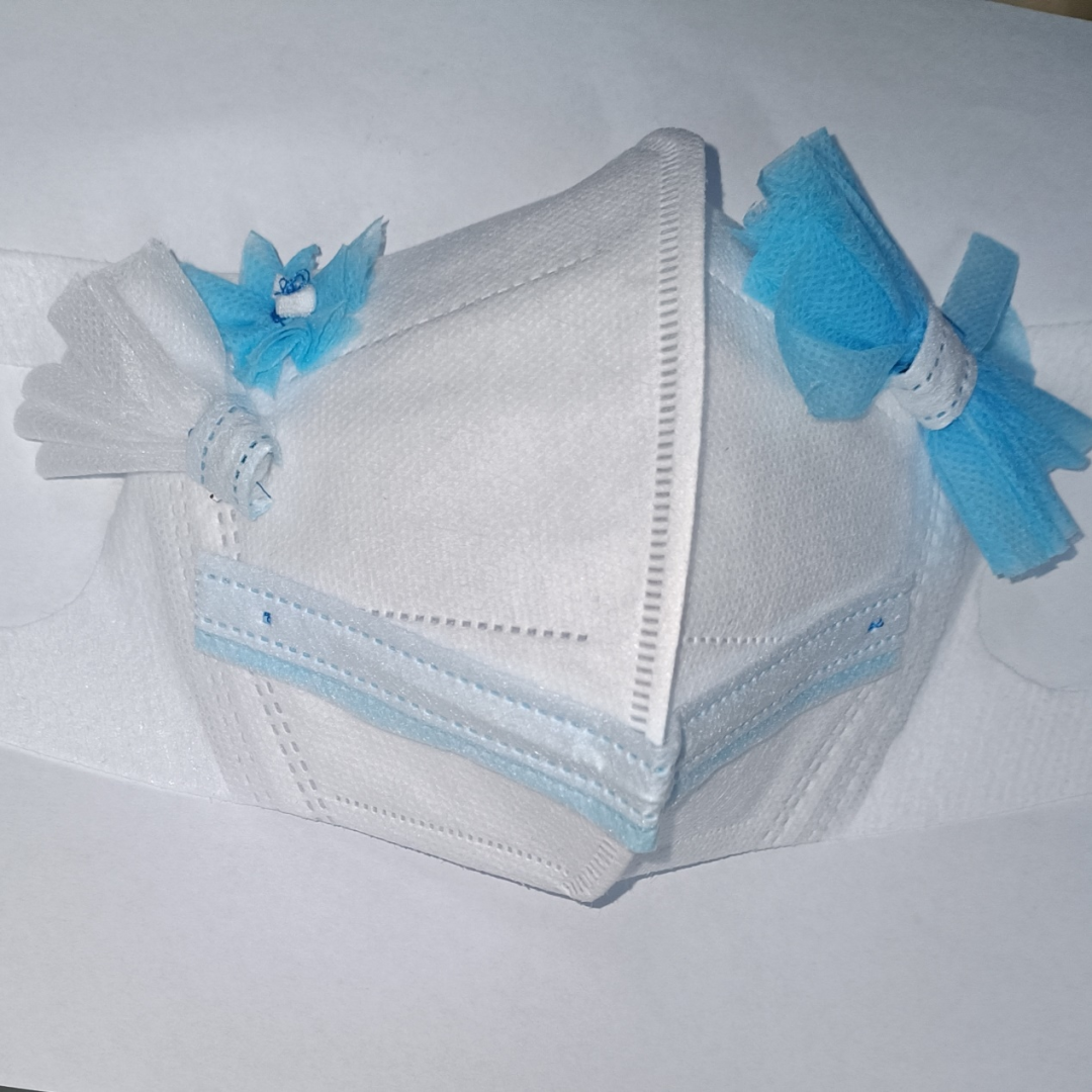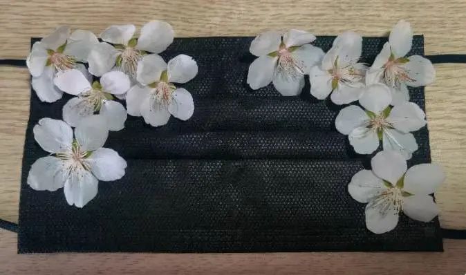 设计说明:疫情阴云笼罩,给一切美好事物都蒙上一层阴翳。本次口罩设计主要以“花”为材料,用花朵为口罩点缀。口罩上一半粘贴着由蓝色口罩制成的蓝色花朵花,一半是白色的扇形落叶形状点缀而成。一方面,花朵的打造与利用代表我们对春天到来的欣喜和对生态、自然的保护。另一方面,美丽的花朵可以愉悦心情,呼吸春天的气息,传递春天的美好,希望这一抹春意,可以拂去大家的疲惫,让大家在不松懈的状态下,保持浪漫的情怀,从容、乐观地应对疫情。